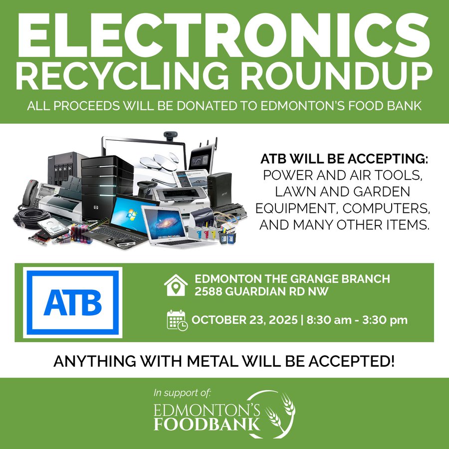 Declutter your home and help the community! Bring your unwanted electronics and small appliances to ATB Edmonton The Grange Branch Electronics Recycling Roundup! All proceeds from recycled items will be donated to the Edmonton Food Bank.
